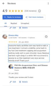 “I had an Achilles injury and could barely walk. After one treatment, I noticed stability returning to my foot. After the second treatment with acupuncture and cupping, I was walking well with no pain. Highly recommend!”
