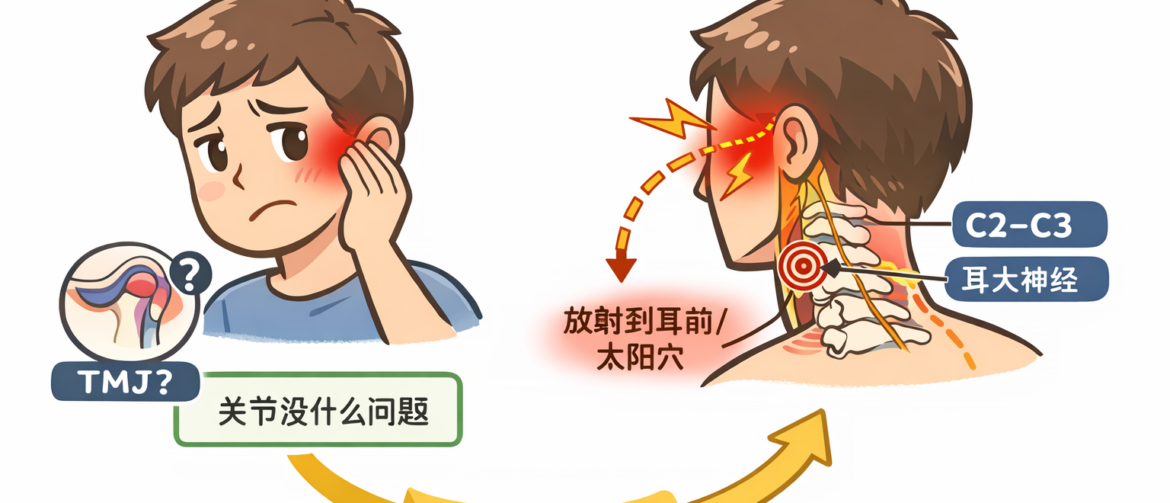 耳大神经牵连/敏化(上游颈段因素参与),而不是TMJ本身病变。