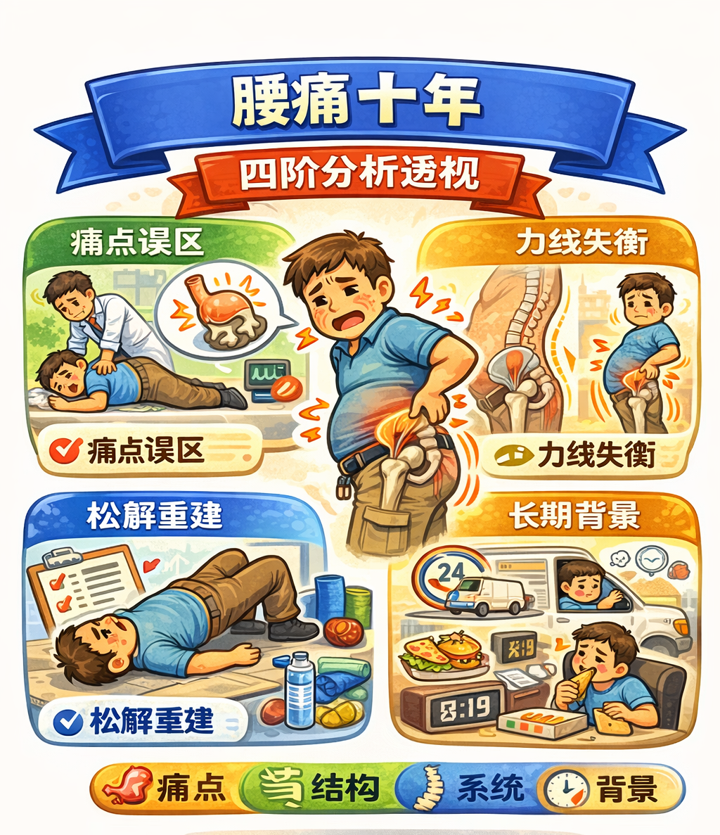 如果只停留在症状层,这是一个再普通不过的慢性腰痛病例。疼痛弥漫、定位不清,压痛不典型,没有明确神经放射痛,也缺乏急性损伤史。多数医生在这一层会自然归入“慢性劳损”“筋膜炎”或“功能性腰痛”范畴,然后进入长期对症处理。