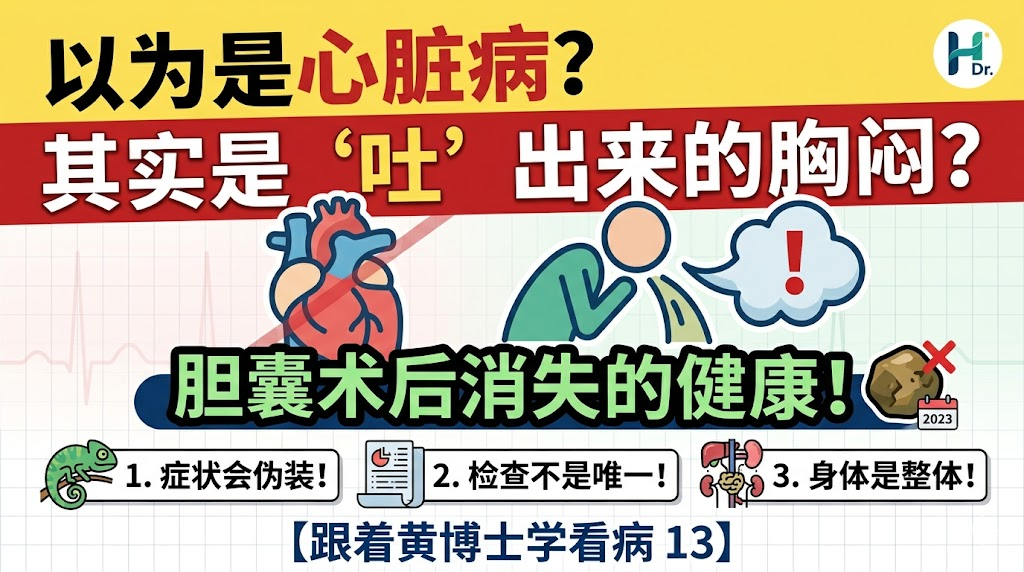 【跟着黄博士学看病 13】 她以为是心脏病,其实是一个“从呕吐演变来的胸闷” 这个病案,我觉得非常有临床价值。不是因为她多复杂,而是因为她把一个问题,从头到尾,完整地在她身上走了一遍。 这个病人五十多岁。她来找我,最主要想解决的,是一种很难受的感觉。她说,胸骨后堵得慌,好像有一股气卡在那里,不顺畅,然后这个感觉会慢慢往上串,一直串到咽喉,喉咙发紧,气上不来,人就很难受。她说不出“疼”,就是压着、顶着、丝丝拉拉的那种不舒服。每次发作,大概十来分钟,严重一点可以到一个小时,但只要坐下来或者躺下来不动,慢慢就能缓过来。 她一开始,在中国一直按心脏病在看的。看了很多专家,做了各种检查,心电图、心脏彩超、运动负荷试验都做了,最后的结论是没有明确的心脏问题。但运动试验又是“可疑阳性”,这就让她一直放不下,总觉得还是心脏的问题。后来甚至被建议去看精神科,吃一些相关的抗焦虑药,没有效果。 她这次来找我看病,是来新西兰看望她的儿子,也算旅游吧。刚开始我听完她的症状,我就否定了“心脏”或者“焦虑”这些问题,因为症状部位,形式都不像。因此,我仔细询问了她的病史。 她所有的问题,是从一次手术开始的。2023年她做了胆囊摘除手术,手术以后不久,就开始出现频繁呕吐。但那个时候,没有胸闷,也没有喉紧,她最主要的表现是吐。很典型的情况是,吃完饭,晚上出去散步,走快一点,就开始恶心,然后就吐。吐出来的大多是食物。如果吐完了还继续走,有时候还会再吐。但如果不动,白天在家,不活动,就不吐。这个状态持续了大半年。 后来,她知道一走快就吐,那就少走,甚至不走。结果吐确实少了,但问题并没有消失。再往后,症状开始变了。她来找我的时候,已经不是以吐为主,偶尔也突,而是变成了现在的胸骨后压迫感,往上串到咽喉,喉咙发紧,呼吸不顺。 看诊时,我让她在楼梯上走了几趟,前两趟还可以,到第三、第四趟,她就开始不舒服了。一开始是胸窝不舒服,然后慢慢往上串,串到喉咙,喉咙发紧,气上不来。 我给她做了详细的身体检查,没有发现明确的阳性体征。 我分析她的病情,我是这样理解的。她最早是胆囊摘除后,引起反复呕吐,长期的呕吐,胃容物对食管持续的刺激,这种刺激,还会让整个食道变得敏感。在这种状态下,食管对压力、对运动、对身体状态的变化,会变得过度反应,而出现胸骨后压迫感,气不顺的症状。再加上食管本身是由迷走神经主导的系统,一旦敏感性提高,很容易带动整个自主神经反应,就会出现喉紧、气上不来、胸闷,甚至牵扯到颈部、后背的不适。所以这个病例,本质上并不是一个点出问题,而是一个系统在出问题。换句话说,这是一个跨系统调控问题。 我这样给她一解释,患者明白了,也理顺了她的问题。因此,我主要做的是放松相关区域的张力,包括膈肌、上胸入口这一带,同时让整个系统松下来,让呼吸和压力调节恢复正常状态。 做完以后,她说,“肩背卸掉了千斤重担,头也解开了,清楚了”。她又在楼梯上走路几趟,好像顺了一点,没有太大的压迫感,气也没有那么顶了。 这个病例,对我来说,有几个很重要的启发。第一,症状是会变化的,从吐到胸闷,再到喉紧,如果只看某一个阶段,很容易误判。其实是同一个问题在不同阶段的表现。第二,辅助检查可以做,结果只是做为参考,但如果和临床对不上,一定要回到病人本身,医生是诊病的主题。 第三,也是更重要的一点,这一类病人,真正要解决的,不只是单个症状,而是整个身体系统,最主要的是自主神经系统。另外,吃完饭后的活动方式、身体的用力方式、呼吸方式,这些都需要调整,否则这一次是胸骨后压迫感消失,还会出现其它症状。 第四,从中医角度来看,该患者表现出明显的“气上冲”特征,类似《金匮要略》中所描述的“奔豚气”上冲胸咽的表现。但其起因并非单纯情志失调,而是由消化系统功能紊乱逐步演变而来,属于一种以现代功能系统失调为基础的“类奔豚表现”。