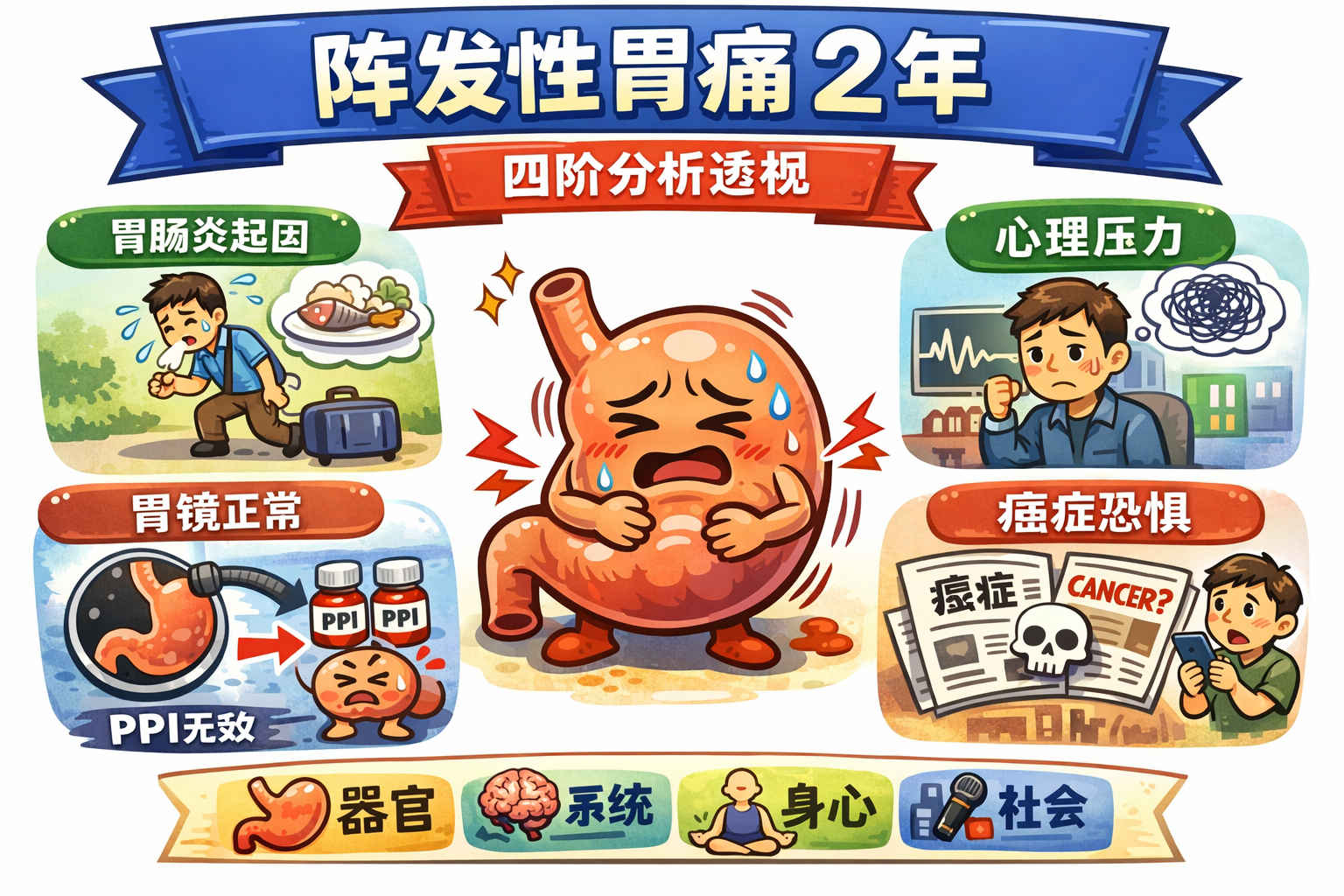 病案 4|阵发性胃痛 2 年 ——从急性胃肠事件到“身—心—社会—神”的系统失衡 ① 病例背景 患者男性,30 岁,Kiwi,体格结实,有海外旅行与生活背景。 病程时间线(核心) 约 2 年前(起点)海外旅行期间突发 恶心、呕吐、腹泻、腹痛,整体表现符合急性胃肠炎 / 水土不服的常见模式。 回到新西兰后急性症状缓解,但遗留: 胃部不适 轻度恶心 对饮食的敏感反应 随后 GP 治疗给予 PPI 连续使用约 3 个月。用药期间症状非但未缓解,反而逐渐加重。 停用 PPI 后约 6 个月内,胃肠道状态逐渐恢复,几乎无明显不适。 近 2 个月因一次饮食诱发,再次出现胃痛、恶心、偶有腹泻。虽可自行缓解,但患者心理负担明显增加。 本次急性发作(24 小时内)出现: 剧烈腹痛 明显恶心、呕吐 腹泻症状强烈,患者已难以接受。 检查情况 胃镜: 胃体、胃窦、十二指肠基本正常 无胃炎、无溃疡、无肿瘤 发现 胃底腺息肉 下食管括约肌松弛 病理结果仍在等待中,患者对结果高度焦虑。 ② 四阶思维解析 第一阶|症状层(看见了什么) 阵发性胃痛 恶心、呕吐 腹泻 对食物刺激高度敏感 […]